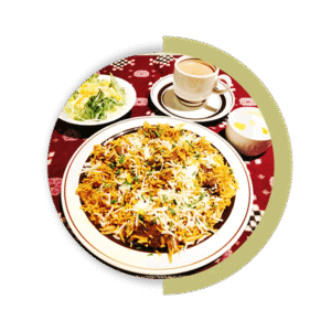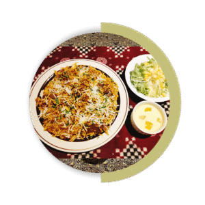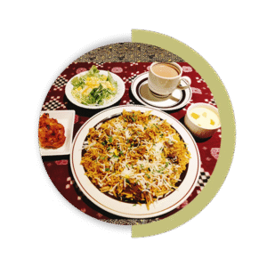 ビリヤニ(チキンまたは野菜)、サラダ、デザート、ドリンク